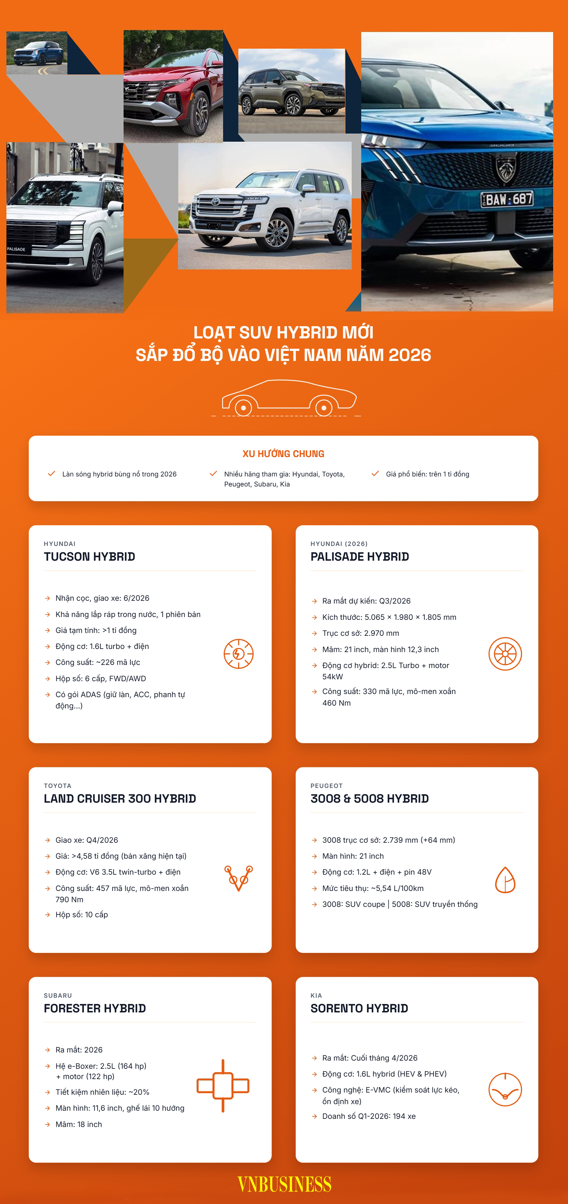 Năm 2026, hàng loạt mẫu SUV hybrid từ Hyundai, Toyota, Peugeot, Subaru hay Kia đồng loạt được nhận đặt cọc hoặc lên kế hoạch ra mắt tại Việt Nam. Mặt bằng giá của các mẫu xe này chủ yếu trên 1 tỉ đồng.